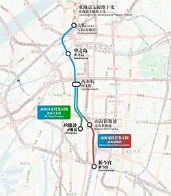 The first proposals to alleviate the problems for both companies through the construction of a new underground line date back to 1982, with further proposals in 1989 and 2004. The line is intended to run primarily under the north-south thoroughfare Naniwasuji (hence the name), branching at its south end to connect both the Yamatoji Line (Kansai Main Line) terminal at JR Namba, and a Nankai line, with Shin-Osaka via a new underground route through what was then JR Freight's Umeda Freight Terminal.[4] The Umeda portion of this plan was eventually incorporated into Phase II of the Osaka Higashi Line project (extension from Shin-Osaka to the underground platforms of Osaka Station), with provisions in place for eventual construction of the Naniwasuji Line itself.