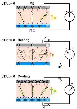The primary pyroelectric effect describes the charge produced in a strain-free case. The primary pyroelectric effect dominates the pyroelectric response in PZT, BTO, and some other ferroelectric materials.[63] The mechanism is based on the thermally induced random wobbling of the electric dipole around its equilibrium axis, the magnitude of which increases with increasing temperature.[64] Due to thermal fluctuations at room temperature, the electric dipoles will randomly oscillate within a degree from their respective aligning axes.
