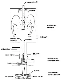 Gas condensation is one way nanophase ceramics are produced. First, precursor ceramics are evaporated from sources within a gas-condensation chamber.[5] Then the ceramics are condensed in a gas (dependent on the material being synthesized) and transported via convection to a liquid-nitrogen filled cold finger.[5] Next, the ceramic powders are scraped off the cold finger and collect in a funnel below the cold finger.[5] The ceramic powders then become consolidated in a low-pressure compaction device and then in a high-pressure compaction device.[5] This all occurs in a vacuum, so no impurities can enter the chamber and affect the results of the nanophase ceramics.[5]