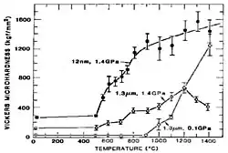 Nanophase ceramics are ceramics that are nanophase materials (that is, materials that have grain sizes under 100 nanometers).[1][2] They have the potential for superplastic deformation.[1] Because of the small grain size and added grain boundaries properties such as ductility, hardness, and reactivity see drastic changes from ceramics with larger grains.