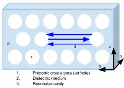 A common photonic crystal nanocavity design shown is essentially a photonic crystal with an intentional defect (holes missing). This structure having periodic changes in refractive index on the order of the length of the optical wavelength satisfies Bragg reflection conditions in the and directions for a particular wavelength range, and the slab boundaries in the direction create another reflective boundary due to oblique reflection at dielectric boundaries. This results in theoretically perfect wave confinement in the and directions along the axis of a lattice row, and good confinement along the direction.[6][7] Since this confinement effect along the and directions (directions of the crystal lattice) is only for a range of frequencies, it has been referred to as a photonic bandgap, since there is a discrete set of photon energies which cannot propagate in the lattice directions in the material.[6] However, because of the diffraction of waves propagating inside this structure, radiation energy does escape the cavity within the photonic crystal slab plane. The lattice spacing can be tuned to produce optimal boundary conditions of the standing wave inside the cavity to produce minimal loss and highest .[1] Beside those conventional resonators, they are some examples of rewritable and/or movable cavities, which are accomplished by a micro infiltration system [13] and by a manipulation of single nanoparticles inside photonic crystals.[14][15]