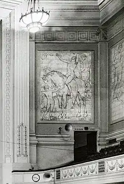 Waller's first mural design failed to win a competition in 1921. His first major mural was for the Menzies Hotel in Melbourne, in 1927. In 1927 he completed murals at the Melbourne Town Hall[12] commissioned for £1,700[13] (a 2021 value of A$138,340.00)[14] and which are classified by the National Trust as historically significant at the State level.[15] They were painted directly, as line drawings, onto the newly installed asbestos Celotex acoustic tiles in a redecoration of the Auditorium after a fire in 1925.[16] Given a free hand in devising the artworks he explained that the figures were not intended to be allegorical, but to create rhythm, and that line-work was used because a skin of paint would interfere with the panels' sound-absorbing quality. The actual painting on the series of 7 metre high by 4m wide wall sections from Waller's half-scale cartoons produced in his Darebin studio was undertaken by H. Oliver and Sons under the artist's supervision.[17] The State Library of Victoria accepted his mural Peace After Victory in 1928.