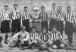 At the beginning of 1908 Naples and SS Napoli, recently affiliated to the FIF, applied for the establishment of a Seconda Categoria (second tier) level Campania regional championship organized by the FIF to which they could register.[7][8] The FIF decided to establish for the first time the Terza Categoria (third tier) Campania championship, in which Naples joined with several other Neapolitan clubs, thus making their debut in a competition organized by the FIF.[9] Naples won this competition in the first season by defeating Audace in the final, and defeated Audace in the final again in 1909 and were promoted to the Southern division of the Seconda Categoria.[10] In 1910, Naples won the first and only Coppa Città di Napoli and defeated Bari 8–2 on aggregate to win the Seconda Categoria Southern Championship for the first time in 1910.[9] The next season they defeated Bari 9–2 on aggregate to win their second-straight Seconda Categoria Southern Championship in 1911.[5]
