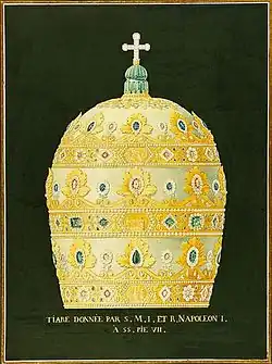 The Napoleon Tiara was a papal tiara given to Pope Pius VII in June 1805[1] a few months after he presided at the coronation of Napoleon I. While lavishly decorated with jewels, it was deliberately too small and heavy to be worn and meant as an insult to the Pope. In the painting of The Coronation of Napoleon by Jacques-Louis David, the tiara is held behind the Pope by one of his aides.