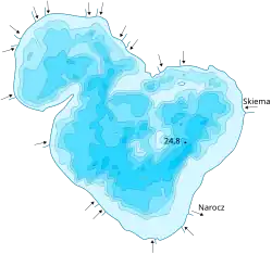 Narach is a part of the Narach lake group (the others being Miastra (Belarusian: Мястра), Batoryn (Belarusian: Баторын), and Blednaje (Belarusian: Бледнае). It was formed about 11 thousand years ago after the Pleistocene ice ages. It has a surface area of 79.6 km2, a wider length of 12.8 km, a maximum depth of 24.8 m, average depth of 8.9 m,[1] a volume of 710 million cubic meters. The lake is surrounded by pine forests. The Narach River flows out of it.