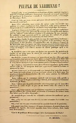 - ^ a b César, Marc (2011). "La Commune de Narbonne (24 - 31 mars 1871)" [The Narbonne Commune (March 24–31, 1871)]. Regards Sur la Commune de 1871 en Francec. Nouvelles Approches et Perspectives (Colloque) (in French).