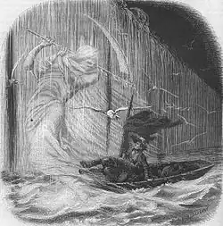 The novel ends abruptly with the sudden appearance of a bizarre enshrouded figure having skin hued "of the perfect whiteness of the snow."[52] Many readers were left unsatisfied by this ending because, as Poe relative and scholar Harry Lee Poe wrote, "it didn't match the kind of clear ending they expected from a novel."[25] Poe may have purposely left the ending subject to speculation.[53] Some scholars have suggested that the ending serves as a symbolic conclusion to Pym's spiritual journey[54] and others suggest that Pym has actually died in this scene, as though his tale is somehow being told posthumously.[55] Alternatively, Pym may die in the retelling of the story at precisely the same point he should have died during the actual adventure.[56] Like other characters in works by Poe, Pym seems to submit willingly to this fate, whatever it is.[23] Kenneth Silverman notes that the figure radiates ambivalence and it is not clear if it is a symbol of destruction or of protection.[57]
