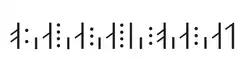 Side C of the stick is carefully carved with 49 signs using the same technique as on the A side.[17] The row begins with four apparently normal runes, aaal, but then continues with a repeated symbol with the appearance of a bind-rune formed of k and reversed upside-down k.[39] These symbols are divided into groups with one-point division marks.[17] In the middle of the line there are again some normal runes, aaaaa, followed by more bind-runes of the same type.[17] The meaning of this row of symbols is unknown. Moltke compared the carving to known systems of coded runes based on the principle of dividing the runic alphabet into three groups (ættir) and referring to each rune by the number of the group and its location within the group. He was unable to arrive at an interpretation in this manner. Nevertheless, Moltke argued that the symbols are carved and organized with such care that they must have a meaning.[40] Marie Stoklund similarly comments that "The inscription has not yet been deciphered, though it looks as if it ought to make sense".[17] Jonas Nordby is less certain that the carvings are based on a cipher system, suggesting that they might be some form of tally.[39]