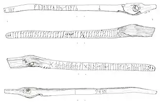 The four sides were labeled A, B, C and D by Moltke. Sides A and C are the broad sides and sides B and D are the narrow sides.[13][c] Side A has an inscription with linguistic content and Side C has what looks like cipher runes. These are both elegantly cut.[14] Side B has the younger fuþark alphabet. It uses the same form of runes as side A but may have been cut by a less skilled hand.[14] Some additional marks on two of the sides appear to be mere scribbles or tests.[15][14] The inscription on side A uses short-twig runes but the form of the s rune is unusual, it has the form normally used for the R rune.[2]