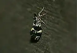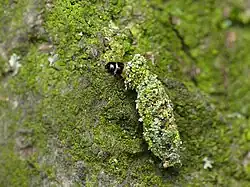 A small (wingspan 7–11 millimeters), stout, black and white moth. The female is somewhat more powerful built than the male, with shorter wings and antennae. The antennae are thin and wire-shaped, a little over half as long as the forewings of the male and slightly less than half as long in the female. The base colour of the head, body and forewing is grey-black. The forewing has two narrow, white, slightly irregular transverse bands that are often interrupted in the middle. The hind wings are dark grey. The larva lives in a pear-shaped larval sac that is often green in color from the algae it feeds on.