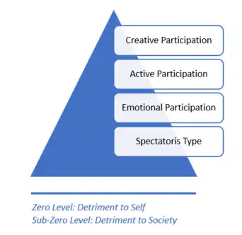 The pyramid begins at the ‘spectatoris-type level’ which includes activities that require no critical thought, such as watching television. Leisure activities in higher tiers allow for the participant to develop as a person and are characterised by a higher level of individual engagement. The apex of the pyramid is the 'creative participation' level, where a person uses their own experience to create a new medium. This can include a painting or a composition. Activities which cause harm to either society or the individual, such as crime or gambling, fall below the pyramid.[2]