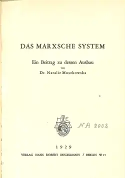 Moszkowska's first book after her thesis was The Marxist System (Das Marxsche System),[4] published in 1929 by the Berlin editor Robert Engelmann. The first part of the book defends the labour theory of value, similar to the point of view of Ladislaus von Bortkiewicz. Moszkowska used an unusually high number of digital examples of the transformation of value into the price of production.
