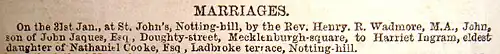Cooke's name was misspelled as "Cook" on the 1849 patent and the misspelling has propagated in chess literature since then.[1][2] The correct spelling can be found in numerous documents, including his business listings in the London Directories (see top picture, right) as well as official announcements of the marriage of his daughter Harriet Ingram Cooke, to John Jaques II, son of John Jaques, the owner of the company that first manufactured the Staunton pieces in 1849 (see bottom picture, right).