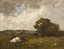 Hone's paintings which were completed in France have many similarities to those that he worked on to his country farm in Co. Dublin, but the finish is perhaps more polished and professional in the later Irish works. Hone produced many pictures at Malahide, County Dublin.[4] One of his finest pieces is Pastures at Malahide (pictured). Cows in the foreground of the painting rest quietly grazing against the low horizon. This allows for a large amount of space to be given to the rich and dominating sky full of white cumulus clouds. The atmosphere is one of peace and tranquility, while being typically Irish with the feeling of impending rain.