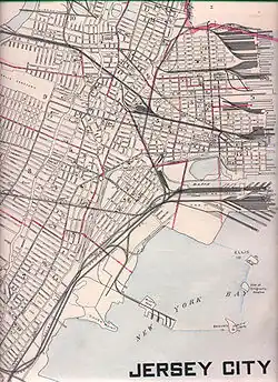 The line is a remnant of the extensive freight rail infrastructure that once dominated much of the Hudson County, its right of way a combination of routes originally developed by different companies. The name is taken from the National Docks Railway which maintained yards and a storage depot at Black Tom, an island in the Upper New York Bay that was greatly expanded by land reclamation and connected to the north of Caven Point by a long causeway.[10][11] The line was built during an era of tremendous growth along the west shores of the bay and the North River (Hudson River), fueled by competing railroads wishing to gain access to the harbor to develop shipping and carfloat operations as well as intermodal passenger transport terminals.[12][13]