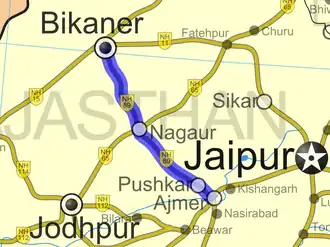 National Highway 89 (NH 89) was a National Highway in India entirely within the state of Rajasthan. NH 89 linked Ajmer to Bikaner and is 300 km (190 mi) long.[1] In 2010, the highway was renumbered to form parts of present-day NH 62 and NH 58, with the section from Ajmer to Nagaur being replaced by NH 62, while the section from Nagaur to Bikaner was renumbered as NH 58.
