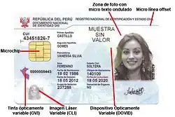 As of July 15, 2013, RENIEC issues the electronic DNI (DNI-e),[1] which will gradually replace the current DNI.[2][3] The electronic DNI is made of polycarbonate and has the format of a credit card, following the ISO 7816 standard. It has a chip based on the technologies of electronic signature, smart card and biometrics, and initially incorporates four software applications: the first identity eMRTD ICAO, the second digital signature PKI, the third biometric authentication by fingerprint Fingerprint Match-on-Card and a generic type room that includes data storage and Counter devices. In June 2015, the electronic DNI was recognized as the best identity document of Latin America, during the "Latin American Conference on High Security Printing" held in Lima, which was organized by the British firm Reconnaissance International, dedicated to holography, currency, authentication and documentary security.[2][4]
