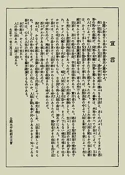 The inaugural conference of the Suiheisha was held on 3 March 1922 at the Okazaki Public Hall in Kyoto, attended by approximately 3,000 delegates from across the country.[25] The conference unanimously approved the Suiheisha Declaration (Sengen), written primarily by Saikō, which became a foundational document for the Buraku liberation movement. It rejected the "pity and charity" of the Yūwa movements and called for self-emancipation, stating: