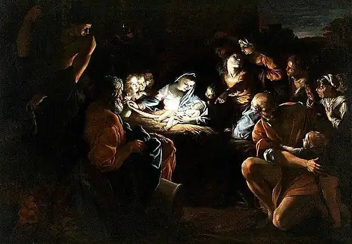 The Nativity painting illustrates a nocturnal scene, wherein the splendorous newborn Jesus lies in his mother's arms, and illuminates up the surrounding faces of adoring shepherds, men and women, and children. The elder man at the right base is presumed to be Joseph, the husband of Mary. Similar luministic arrangements of this or a similar subject had been painted previously by Correggio and Barocci.