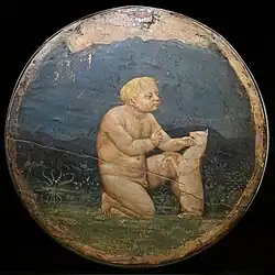 On the reverse side of the tray is a painting of a naked baby boy, a common feature of birthing trays, probably exposed during the pregnancy to encourage the birth of a healthy boy. He is in a meadow playing with a cat (possibly a dog).