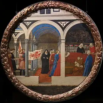 The upper side of the tray shows a scene soon (probably a few days) after the actual birth of a child. It takes place on the ground floor of a well-to-do contemporary house, a palace with white and black stone facings in a very modern style for Tuscan architecture. There is an arcade of round arches on Corinthian columns leading to a garden, with a courtyard at left, where the banners attached to the trumpets giving a fanfare inform us that the event takes place in Florence: a red lily on white ground. A cutaway view, removing the bedroom wall nearest the viewer, is used; Giotto and others had used this compositional device.