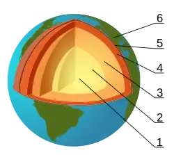 Earth's layered structure: (1) inner core; (2) outer core; (3) lower mantle; (4) upper mantle; (5) lithosphere; (6) crust