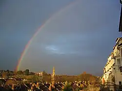 A rainbow is an optical and meteorological phenomenon that causes a spectrum of light to appear in the sky when the Sun shines onto droplets of moisture in the Earth's atmosphere.