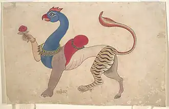 The animal is a common motif in the Pata-Chitra style of painting, of the Eastern Indian state of Odisha. It is considered an astral form of the god Vishnu, or of Krishna, who is considered an avatar of Lord Vishnu. It is considered a variant of the virat-rupa (omnipresent or vast) form of Krishna, that he displays to Arjuna, as mentioned in the Bhagavad Gita, a part of the epic Mahabharata.[2]