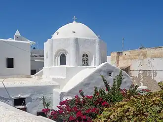 Bourgos (Greek: Μπούργος) is the name of the district north of the castle. Traditionally, it was inhabited by the city's merchants and artisans, and, in general, by a 'middle class' of people whose main occupation was not agriculture.[11] The name comes from the Venetian word borgo, which refers to a kind of fortified settlement. This part of the city was lightly fortified and only accessible by three gates. The houses are built very close to each other, with the streets being very narrow and winding, with a lot of dead ends. This layout is often likened to a labyrinth, and it is believed that it was built this way in part to disorientate any intruders, most notably pirates.[11] All roads going in or out of Bourgos eventually lead to the castle or towards the sea.[11] The area has a high density of churches,[13] some small squares, arched passageways, and white houses, following the typical Cycladic architecture.[13] Right next to Bourgos, outside one of the gates, there is the neighborhood of Evriaki (Greek: Εβριακή, meaning 'Jewish'), which used to be the city's Jewish quarter.