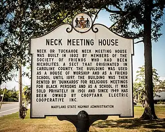 The Neck Meetinghouse and Yard, also known as the Quaker Meetinghouse and Graveyard, is a historic Quaker meetinghouse located at West Denton, Caroline County, Maryland. It is a one-story rectangular frame building with a pitched gable roof measuring 30 feet, 812 inches long and 20 feet, 5 inches deep. In the graveyard are six marked burials with stones dating from the 1850s to 1890, with some more recent interments. It is the only extant Friends meeting house in Caroline County, and one of only a few still standing on the Eastern Shore. The meeting house was utilized from September 26, 1802, when the first meeting was held in the building, until it was abandoned in 1890 for lack of funds and participants.[2]