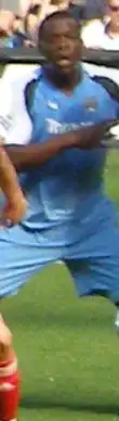 However, Onuoha missed the start of the 2005–06 season, due to a hamstring injury.[29][26] His first appearance of the season came on 23 August 2005, coming on as a late substitute, in a 2–1 win over Sunderland.[30] After being dropped from the first team in early–September, Onuoha returned against Doncaster Rovers in a League Cup match, where he was red carded for the first time in his career, after a collision with Rovers goalkeeper Andy Warrington. The red card was later rescinded however Manchester City went on to lose the game on penalties.[31] Since returning to the first team, Onuoha continued to fight for his first team place, competing in the defensive starting line–up for the side.[32] However, he soon suffered a groin injury that saw him sidelined for two months.[33] While on the sidelines, Onuoha was awarded BBC North West Sports Personality of the Year Award for newcomer honour.[34] It wasn't until on 12 December 2005 when he returned from injury, starting the whole game, in a 4–1 win over Birmingham City.[35] Onuoha was featured in the next six matches since returning from injury.[36] Amid to the first team, he was linked with a move to Liverpool but was happy to stay at the club.[37] However, Onuoha damaged his knee ligament that kept him out for the rest of the 2005–06 season.[38] He went on to make twelve appearances in the 2005–06 season.