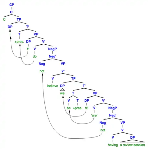 Phrase [DP I ] do not believe [TP we are having a review session]