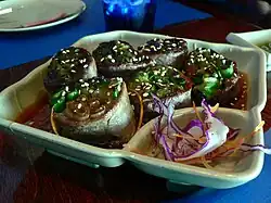 Negimaki (ねぎ巻き) is a Japanese American food consisting of broiled strips of meat marinated in teriyaki sauce and rolled with scallions (negi).[1] Originally beef was used, but negimaki are also commonly made with other meat such as chicken.