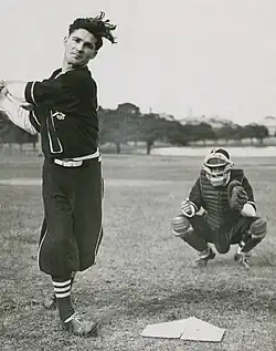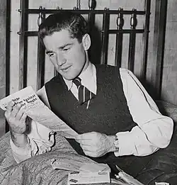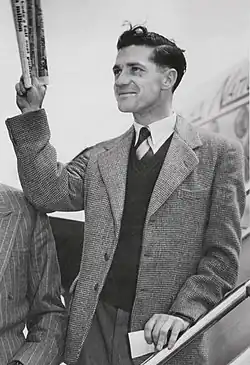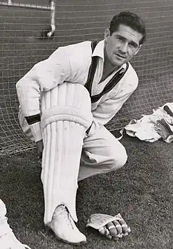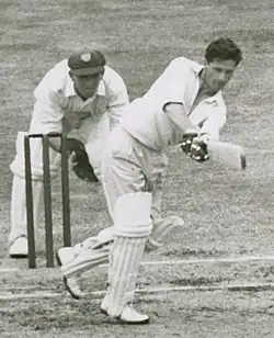 At first, Harvey struggled in the English conditions, failing to pass 25 in his first six innings.[8] His most notable contribution in the early stages of the campaign was against Yorkshire in Bradford, on a damp pitch that suited slower bowling.[8][21] The match saw 324 runs fall for 36 wickets.[22] No sooner had Harvey walked out to bat, stand-in captain Lindsay Hassett was caught to leave Australia at 5/20 in pursuit of 60. To make matters worse, Sam Loxton was injured and could not bat, so Australia were effectively six wickets down and faced its first loss to an English county since 1912.[23] Harvey had scored a solitary run when he hit a ball to Len Hutton at short leg, who dived forwards and grabbed it with both hands before dropping it. Harvey then swept the next ball for a boundary.[22][23] Colin McCool was out at 6/31 before Harvey and wicket-keeper Don Tallon steadied Australia. Harvey was reprieved on 12; he charged the bowling but the wicketkeeper fumbled the stumping opportunity. Harvey then hit the winning runs with a six over the sightscreen, ending unbeaten on 18 not out. It was the closest Australia had come to defeat for the whole tour.[22][24]