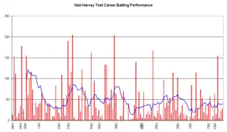 From there on, Harvey's series was unproductive, failing to pass 31 in the six innings of the final three Tests. Australia's form slumped along with that of Harvey, losing the next two Tests and the series 3–1. Harvey ended with 354 runs at 44.25 for the series.[14] Despite this, he continued to productive in the other first-class matches and was by far the most productive batsman in the 1954–55 Australian season, accumulating 1100 at 47.83 runs ahead of Les Favell's 663.[72] He scored a pair of 62s in a 36-run win over New South Wales, 95 and 66 against Queensland and 82 and 47 in a match for a Tasmania Combined XI against England.[8]