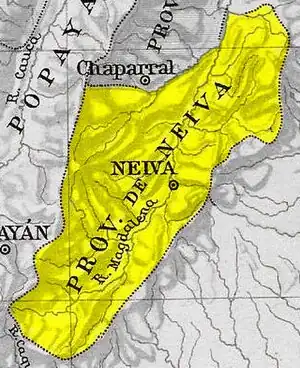 Neiva Province was one of the provinces of Gran Colombia. With the 1824 changes in the subdivisions of Gran Colombia, it became part of the Cundinamarca Department.