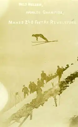 During the 1925 Winter Carnival Tournament, Nelsen, sick with influenza, set a world record at the Big Hill.[4] Jumping 73 meters (240 ft), the record remained until it was broken by Adolph Badrut at Bernina-Roseg-Schanze in Switzerland in 1930, who jumped 75 meters (246 ft). However, Bob Lymburne was able to again claim the world record for the Big Hill, when he jumped 82 meters (269 ft) in 1932.[8] Although accepted as a record, it was not at the time favored in Europe to stress distance records. This was because it was regarded that simply building a larger hill would undoubtedly give a longer jump, and in part because such records did not take style into consideration.[9] Nelsen and Melbourne McKenzie planned to travel to St. Moritz, Switzerland, to attend the 1928 Winter Olympics, but lack of funding meant that they planned for work for their fare on a freighter. These plans were stopped by officials from the British delegation, who felt it was inappropriate and not fitting for the team, and Nelsen never competed in any Winter Olympics.[5][6] Nelsen kept his amateur status, but did well against professionals those times he competed against them.[9] During the winter of 1932, he worked as a ski instructor in Quebec. In a hunting accident in 1932, he lost a hand, and never jumped again.[5][10]
