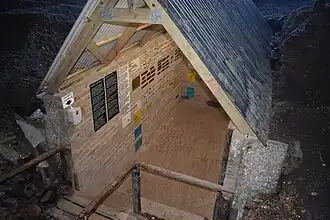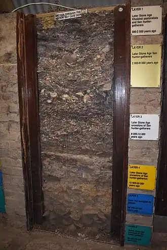 The cave's stratigraphy is divided into three main sediment layers: the lower bed, the intermediate bed, and the upper unit. The lower bed of the cave has MSA deposits that occur in sterile gray loam and iron-rich sediments. Above the sterile layer is a layer that mainly contains materials from the Robberg Industry. This is followed by LSA artifacts, including marine mammals and shell middens dated to the Holocene.[10][11] These main sedimentary layers are then divided into smaller descriptive units. The bottom units are natural sediments and those include the basal loam (BL), pale brown loam (PBL), black loam I (BL I), black loam II (BL II), black loam III (BL III), rubble horizon, gray loam I (GL I), gray loam II (GL II), yellow stony loam (YSL), and brown stony loam (BSL). Following these are sedimentary units mainly consisting of cultural material. These include the gray-brown shelly loam (GSL), crushed shell midden (CS), brown soil below midden Jake (BSJB), midden Jake (J), midden rice A and B (Ra and Rb), brown soil below middens Glen and Helgren (BSBH/G), midden Helgren and Glen (H/G), brown soil below middens Ivan and Betsy (BSBB/I), middens Ivan and Betsy (B/I), and grey ash above midden Ivan (GAI). On top of GAI lies the pit fill, which has a mixture of debris and cultural material, which is also mixed with loamy sand. Abbreviations of the sedimentary units appear in later research and the full names are described by Klein (1972).[4][10][11][12] Units from the basal unit till the pale brown loam are correlated to the interglacial and early glacial period; black loam I till the rubble horizon falls within the lower pleniglacial and inter-pleniglacial period; gray loam II till the BSBJ fall within upper pleniglacial and late glacial; and units from J till GAI fall within the Holocene.[12]