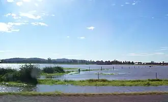 Nelsons Plains is a wedge-shaped suburb, bisected by Seaham Road, with the point of the wedge in the south-eastern corner where the Williams River joins the Hunter River.[6] This part of the suburb is generally less than 2 metres (7 ft) above river level, making it subject to periodic flooding, as happened during the June 2007 Hunter Region and Central Coast storms. In the north-eastern corner of the suburb elevations reach up to 42 m (138 ft) but to the east of Seaham Road, between the road and the Williams River, the ground slopes quickly downward to a height of less than 2 m (7 ft) above river level, making this part of the suburb also subject to flooding.