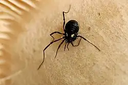 The body is small and rotund and 2.5 mm long. It is black with two large white, pale yellow cream-coloured or silver patches on the cephalothorax. Some specimens lack the patches and are entirely black. The legs are short.