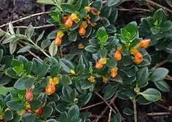 Growing to 0.5 m (1.6 ft) tall by 1 m (3.3 ft) broad, in its native habitat, N. gregarius is an epiphytic (tree-climbing) perennial subshrub with small and fleshy, usually waxy and shiny, dark green leaves, with brilliant-orange, tubular flowers appearing in the summer. The flowers vaguely resemble clogs or rotund goldfish in shape and color, hence the common names; some gardeners have nicknamed it the "guppy plant", as well as "garibaldi plant" or "garibaldi flower" due to its resemblance of the marine fish species Hypsypops rubicundus, the California garibaldi.