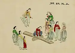 Neolttwigi or nol-ttwigi (Korean: 널뛰기; lit. board jumping) is a traditional game of Korea typically played by women and girls on traditional holidays such as Korean New Year, Chuseok, and Dano.