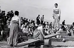 It is thought that yangban women developed neolttwigi to see over the walls that surrounded their homes, as women in traditional Korea were rarely allowed out of their living compounds, except at night.[1] According to a legend, a wife who wanted to see her husband, trapped in a prison beyond a high wall, could catch a glimpse of her husband's face by using a neolttwigi in collaboration with another prisoner's wife.[2]