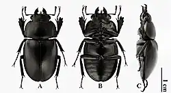 Adults reach a length of 42.3 mm long and are mostly black, with the elytra blackish along the suture, the disc gradually changed from black at the base to rufous towards the apices. The body somewhat lustrous and glabrous. Some yellowish hairs are present on the mouthparts, anterior and posterior margins of the pronotum and legs.