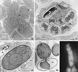 | Nephridiophaga blattellae, 10–13 transmission electron microscopy, 14 Calcofluor white staining. 10 Meront with several nuclei (n) and mitochondria (mi) in the lumen of Malpighian tubule. Inset: Mitochondrium with tubular to sac-like cristae. 11 Sporogenic plasmodium containing mature spores (sp), mitochondria (mi), and vegetative nuclei (n) in the cytoplasm. The plasmodium is anchored to the microvilli (mv) of epithelial cells (ep) of the tubule. 12 Young spore within the cytoplasm of a sporogenic plasmodium, surrounded by a layer of vesicles. The spore cytoplasm contains one nucleus (n), mitochondria (mi), and endoplasmic reticulum (er). 13 An infectious sporoplasm hatches through the central spore opening, leaving behind the spore wall of the emptying spore (sp). The nucleus (n) is squeezed through the tiny spore opening. 14 Calcofluor white stains the spore wall indicating the presence of chitin (bluish color). Scale bars: 1 µm (10–13), inset 0.1 µm (10), 5 µm (14) | |
