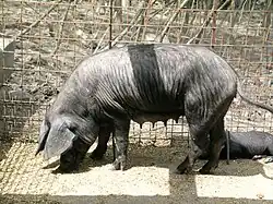 The Nero di Parma is a breed of pig from the province of Parma, in the Italian region of Emilia-Romagna. It is a modern recreation of the ancient Nera Parmigiana breed, which became effectively extinct in the second half of the twentieth century, following the importation of pig breeds from Britain, though it is still listed in DAD-IS.[1] From the mid-1990s, the breed was re-created from a small number of primitive animals located in the areas of Santa Margherita di Fidenza, Bardi, and Pellegrino Parmense, and in 2008 numbered about 300. A herdbook is kept by the Associazione Nazionale Allevatori Suini, the Italian national association of pig-breeders.[2]: 443–44 It is not among the pig breeds recognised by the Ministero delle Politiche Agricole Alimentari e Forestali, the Italian ministry of agriculture and forestry.[3]: 8–9