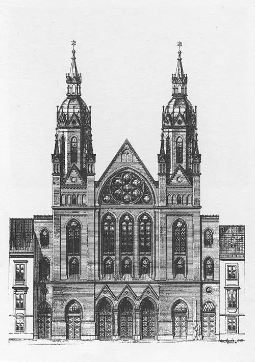 Commissioned by Baron Moritz Freiherr von Königswarter who established the congregation in 1903, and designed by Max Fleischer in the North-German Gothic Revival style, the synagogue was completed in the same year.[1] Constructed mostly of brick, including the façade and the two towers, the main hall of the synagogue was divided by pillars into three naves; allowing more than 300 worshipers to be seated on the ground level. The women sat separate from the men and could watch the proceedings from the balcony on the second floor. The synagogue had excellent acoustics.