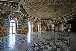 On the ground floor behind the vestibule is the Grotto Hall, attributed to Carl von Gontard, with walls encrusted with shells, stones, marble, quartz and semi-precious stones, which were enriched in the 19th century. Part of the design of the Groto Hall is a marble floor depicting marine animals and plants and an 1806 ceiling painting, Venus and Amor, the Three Graces and Putti. Attributed to Johann Gottfried Niedlich, the painting has replaced an earlier work. Niches around the room contain statuary and fountains, with cut crystal chandeliers hung in the arches.