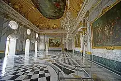 The Marmorgalerie adjoins the Grotto Room, containing red jasper and white marble from Carrara. Large mirrors face the windows, while the three-part ceiling painting by Christian Bernhard Rode depicts morning, noon, and night.[2]