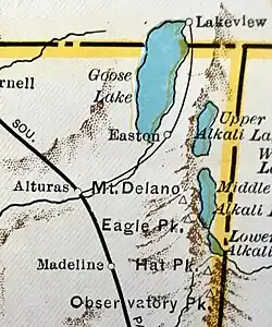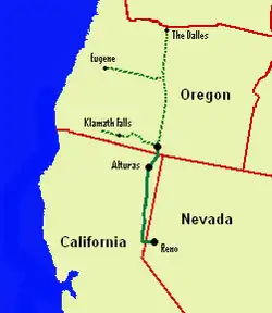 The next northward extension commenced in 1899. In April 1902, the line reached Madeline, California. The tracks were extended to Likely, California, in October 1907; Alturas, California, in December 1908; and finally, Lakeview, Oregon, on January 10, 1912.[3] The company planned to continue north through Prineville, Oregon, to The Dalles, with separate branches running west to Klamath Falls and on to the Rogue River Valley, and over the Cascade Mountains to Eugene, Oregon, in the Willamette Valley. However, no further construction ever took place.[1]